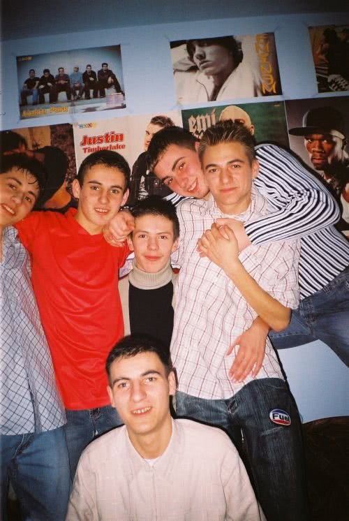 Fotografie: escorte de lux italia .jpg un grup de tineri, in jurul unui barbat chel si cu barba, stau relaxati intr-o camera plina de fotografii pe pereti. Imbracati in costume cu dungi si zambind seducator, acestia emana o energie vibranta. privirea lor intensa te atrage, iar detaliile erotice ale hainelor si expresiilor creeaza o atmosfera plina de mister si pasiune.