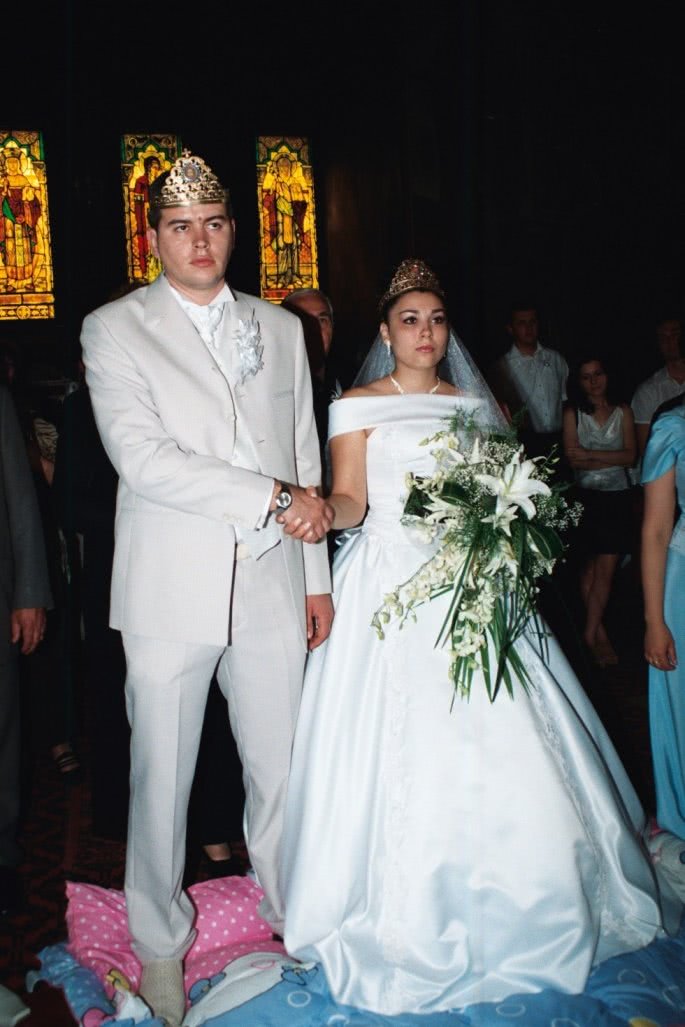 Foto: soundcreation timisoara .jpg un cuplu imbracat in haine de nunta se afla alaturi, in fata vitraliilor colorate si a unei paturi albastre. femeia, cu parul negru si rochie eleganta, emana senzualitate si rafinament, atragand privirea spre formele sale seducatoare. barbatul o priveste admirativ, iar atmosfera incarcata de eleganta gothic ascunde tensiune si dorinta subtil accentuata.