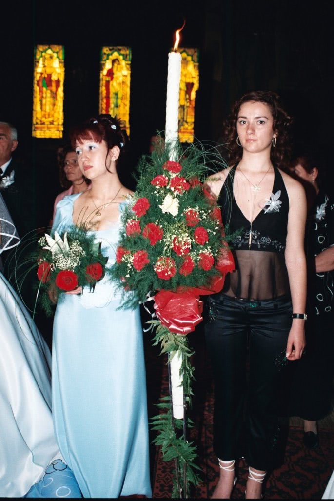 o femeie tine in mana un buchet de flori elegante, in timp ce alaturi se afla o alta doamna imbracata intr-o rochie seducatoare, intr-o biserica romantica. parul ei negru si cel castaniu contrasteaza cu stralucirea bijuteriilor delicate si a florilor rosii pasionale. liniile senzuale ale corpului si privirile pline de dorinta emana o atmosfera intens erotica si rafinament.