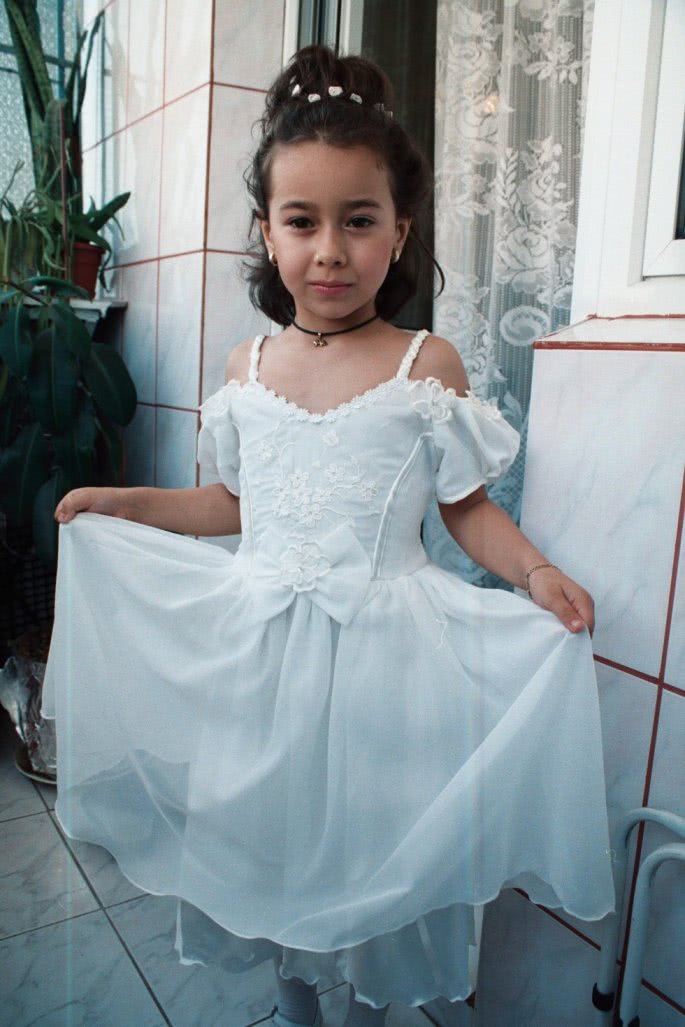 o fetita in rochie alba, stand singura pe un podea patrata, cu parul negru si un colier delicat. rochia se ridica subtil, dezvaluind picioarele fine, in timp ce ea face o plecaciune eleganta. In coltul camerei, o planta verde adauga farmec scenei intime si rafinate. atmosfera de neoclassicism plina de senzualitate subtila si eleganta purtatoare de dorinta.