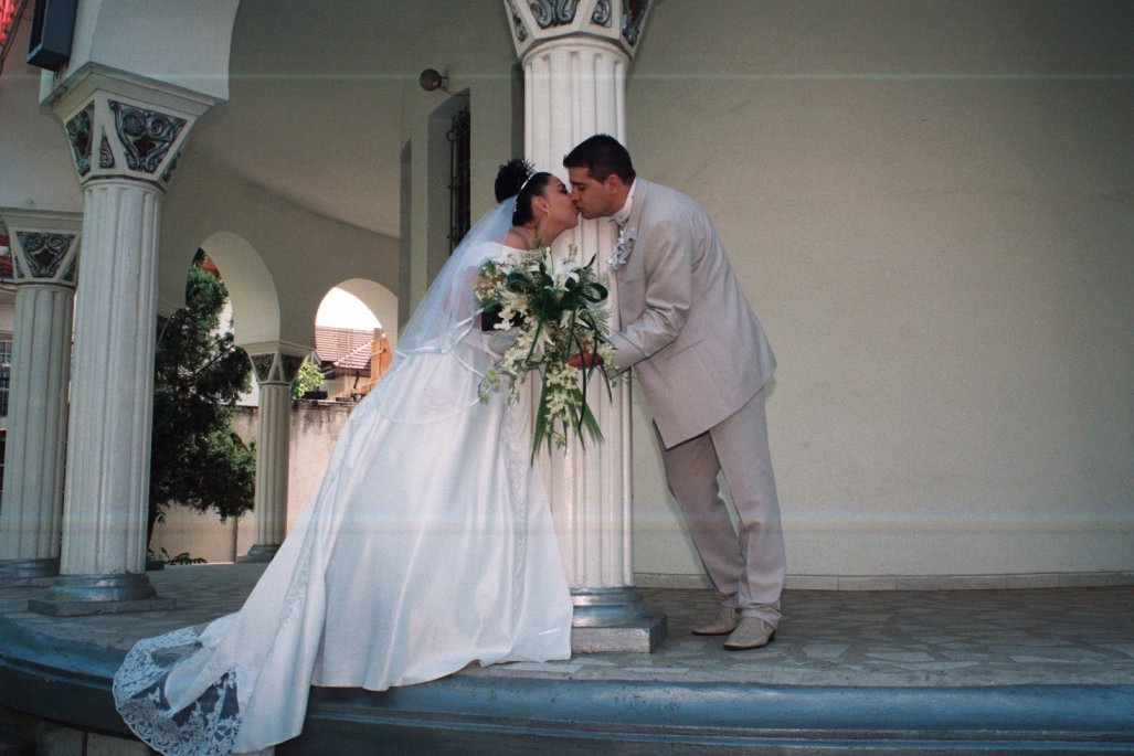 un cuplu de miri se saruta pasional pe o veranda eleganta, invaluiti in lumina calda a unei fotografii color. rochia alba stralucitoare si voalul delicat accentueaza frumusetea lor, in timp ce buchetul vibrant si privirile inchise adauga un aer intim si seducator. atmosfera romantica este completata de draperii moi si detalii arhitecturale impresionante din fundal.