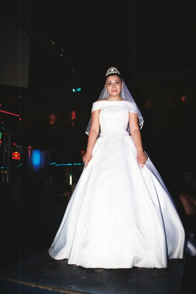 Fotografie: public24 ploiesti matrimoniale .jpg o femeie seducatoare, imbracata intr-o rochie de mireasa alba, se afla pe scena. voalul delicat ii incadreaza chipul si o tiara stralucitoare ii incanta privirea. In pozitie eleganta, evidentiind formele sale voluptoase, emana o frumusete purtatoare de dorinta sub lumina subtila a scenei.