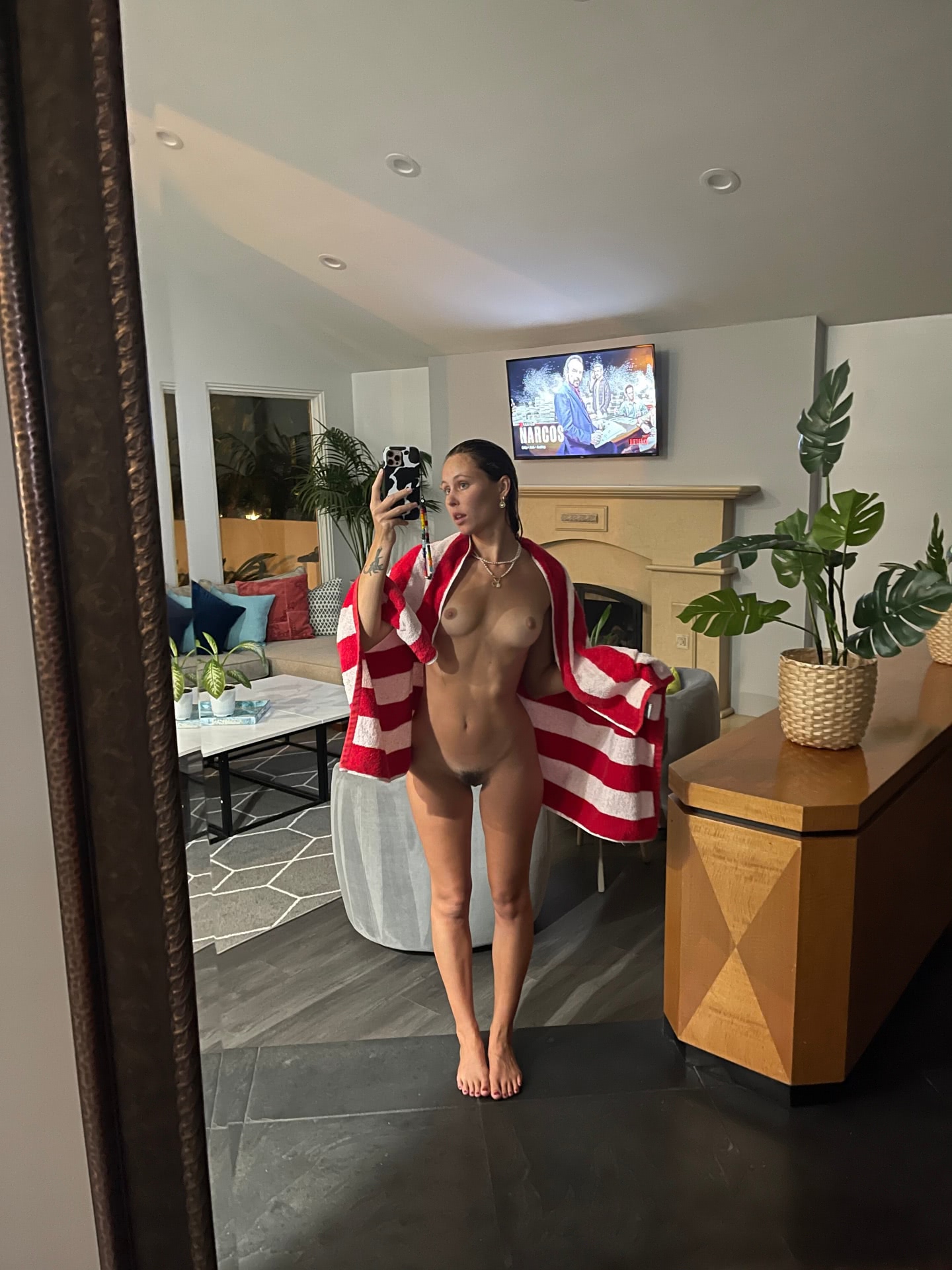 Imagine: dk sex .jpg o femeie isi face selfie in oglinda, cu un prosop strans in jurul trupului, dezvaluind curbele senzuale si pielea intunecata. zambeste seducator, cu parul scurt si privirea provocatoare. In fundal, televizorul si plantele adauga intimitate scenei intime, iar lumina joaca delicat pe corpul ei nud, accentuand fiecare detaliu erotic.
