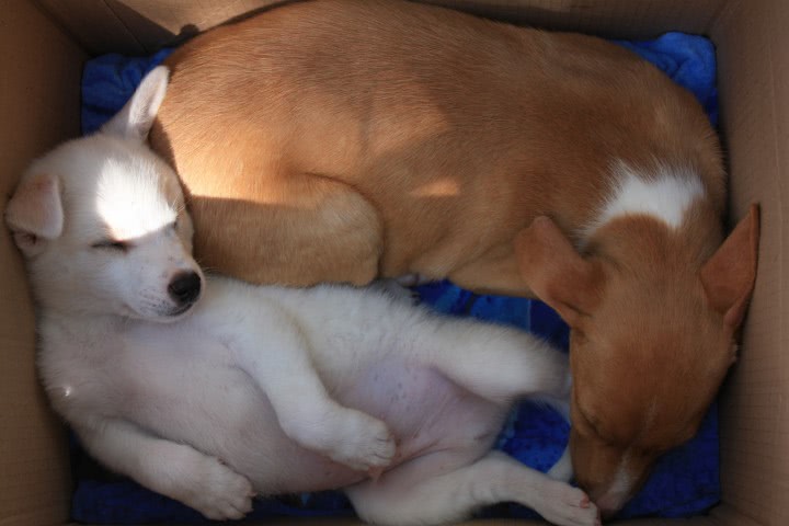 Fotografie: stiri suceava ultima ora .jpg un caine si un pui de caine se cuibaresc impreuna intr-o cutie, adormiti linistiti, capetele lor atingandu-se tandru. corpuri superflat, adorabile si pline de farmec, oferind o priveliste intima si senzuala. limbi strengare ies usor din gurile lor, accentuand frumusetea naturala si delicata a momentului. o scena realista ce imbina inocenta cu erotismul subtil.