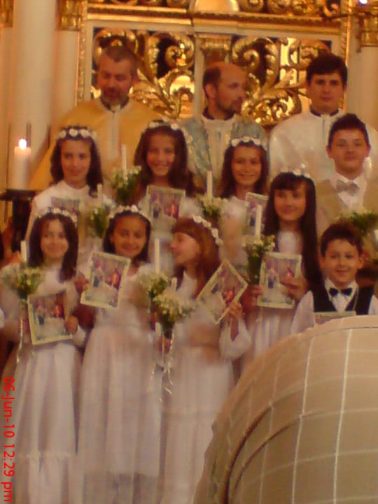 Ilustratie: hipersexualitatea la barbati .jpg un grup de tineri in rochii albe, tinand poze cu alte persoane imbracate la fel si flori, stau inaintea altarului bisericii. In lumina difuza a unei fotografii vechi, chipurile lor expresive si gurile larg deschise adauga o nota de mister si pasiune scenei pline de emotie intensa.