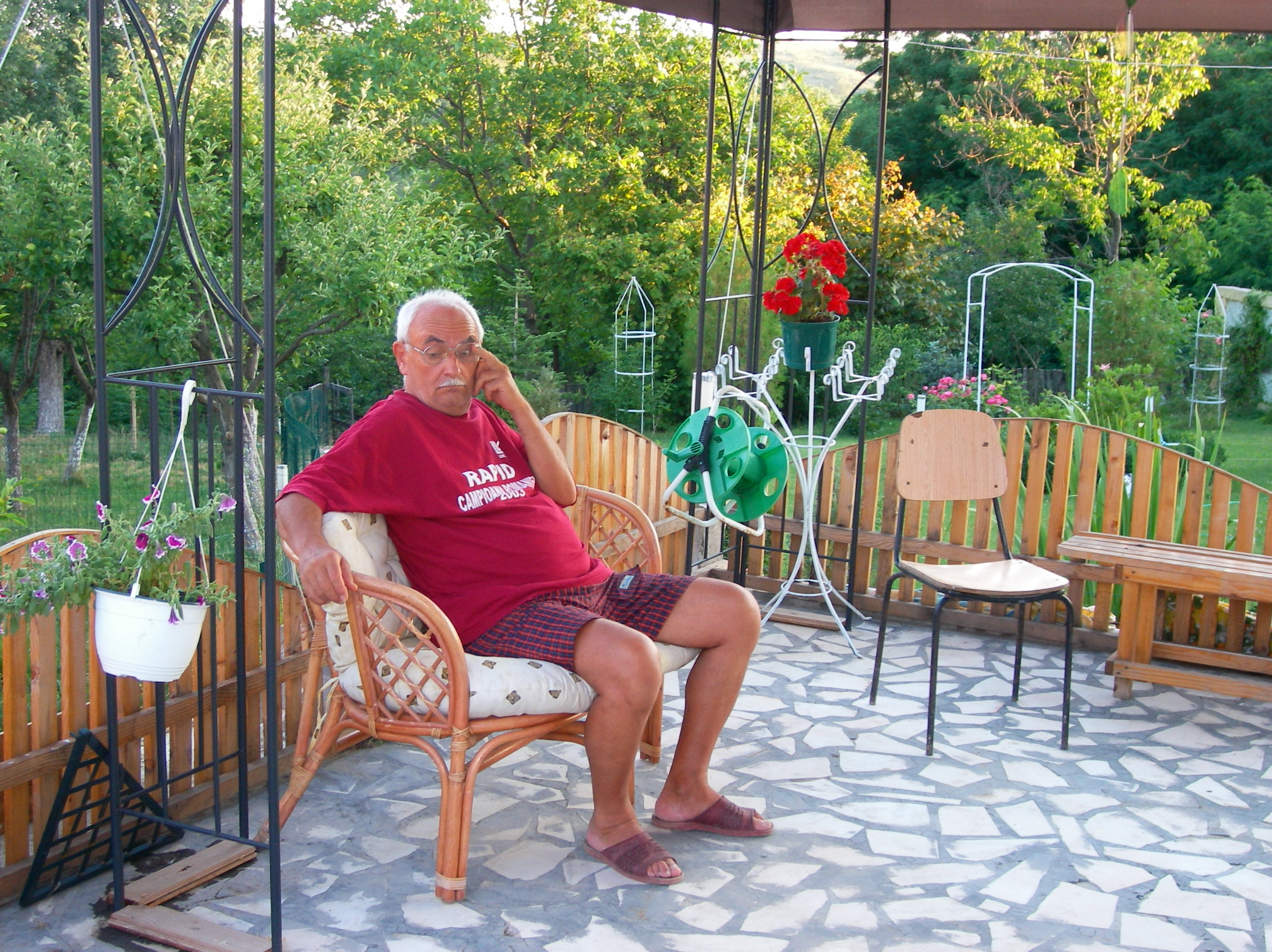 Ilustratie: romanian chat free .jpg un barbat chipes, cu chipul brazdat de riduri si o privire seducatoare, sade relaxat pe un scaun in curtea insorita. pielea sa luminoasa contrasteaza cu parul ras si barba subtila. In apropiere, flori rosii si verdeata luxurianta accentueaza atmosfera intima, creand un decor plin de farmec si pasiune in aer.