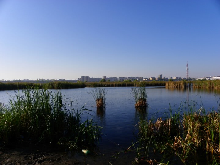 Ilustratie: gay care platesc .jpg un lac cu plante acvatice si cladiri in fundal, sub un cer albastru cu cateva nori la distanta. peisaj panoramic, o pictura ecologica de boleslaw cybis, copac gol, ramura, tufis, nori pufosi. detaliile erotice ale naturii se impletesc armonios: par lung si foarte lung valurandu-se in vantul bland al zilei. o priveliste idilica a unei lumi neatinse de mana omului.