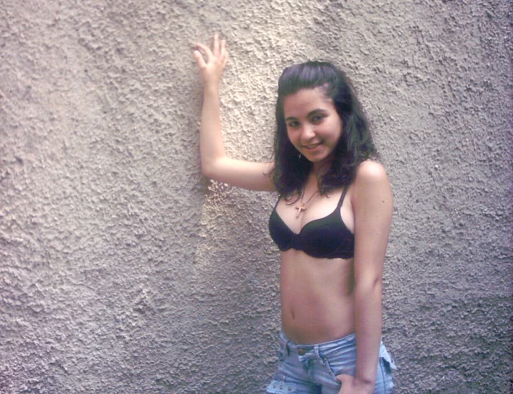 Foto: Ali 12 yr .JPG . o femeie in top de bikini si sorturi din denim pozeaza cu mana sprijinita de un perete, intr-o fotografie veche si provocatoare. par negru, sanii fermi, decolteu ademenitor, bijuterii stralucitoare. detalii realiste subliniaza farmecul ei: buze senzuale, par lung si ochi care te privesc direct. un mix seducator de elemente ce te captiveaza instantaneu.