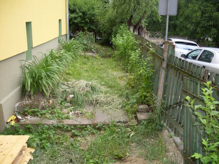 Fotografie: eschorte cluj napoca .jpg o curte cu un gard si o masina parcata in fundal, iar in prim-plan un cladire cu usa galbena si un gard, arta ecologica, acoperit de vegetatie salbatica. fotografie realizata de boleslaw cybis. cladire, tufis, masina, ziua, gard, padure, iarba, vehicul terestru, casa, muschi, natura fara oameni vizibili. peisaj salbatic cu drum asfaltat incadrat de plante si copaci.
