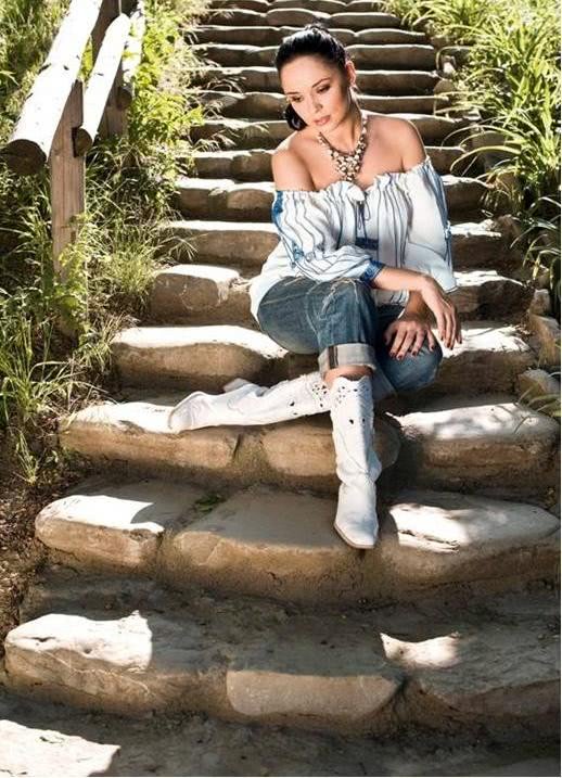 Foto: 0 150143 andreea2 .jpg o femeie sta pe o scara purtand cizme albe si un top albastru, cu un colier la gat. imagine promotionala in stilul scolii americane barbizon, coperta de album. detalii picante: umar gol, par negru, natura salbatica in jur - iarba, copaci, roci. o atmosfera seducatoare si misterioasa este evidentiata de prezenta ei solitara in mijlocul naturii salbatice.