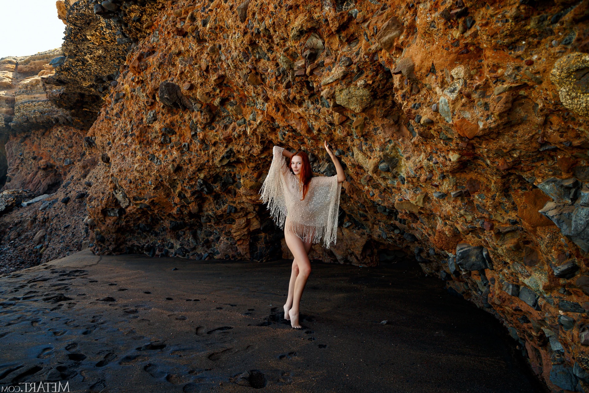 Fotografie: dame bt .jpg o femeie in rochie alba, stand in pestera de coasta, cu bratele ridicate si picioarele larg deschise. lumina calda a toamnei si frunzele ruginii se impletesc cu focul si roca topita, creand o scena erotica plina de pasiune si mister. eleganta salbatica in mijlocul naturii primitive.