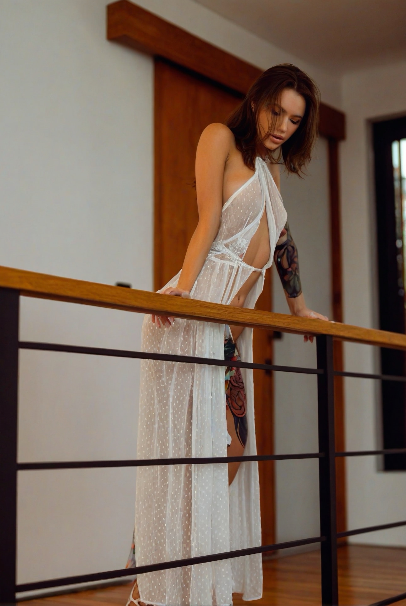 Foto: coafeza la domiciliu timisoara .jpg o femeie seducatoare, imbracata intr-o rochie alba vaporoasa, stand pe o grinda intr-o camera cu usi de lemn. pielea ei delicata si tatuajul erotic atrag privirea, in timp ce parul lung si brunet ii cade senzual pe umeri. privirea intensa catre cel care o priveste dezvaluie dorinta si mister, creand o atmosfera incarcata de erotism subtil.