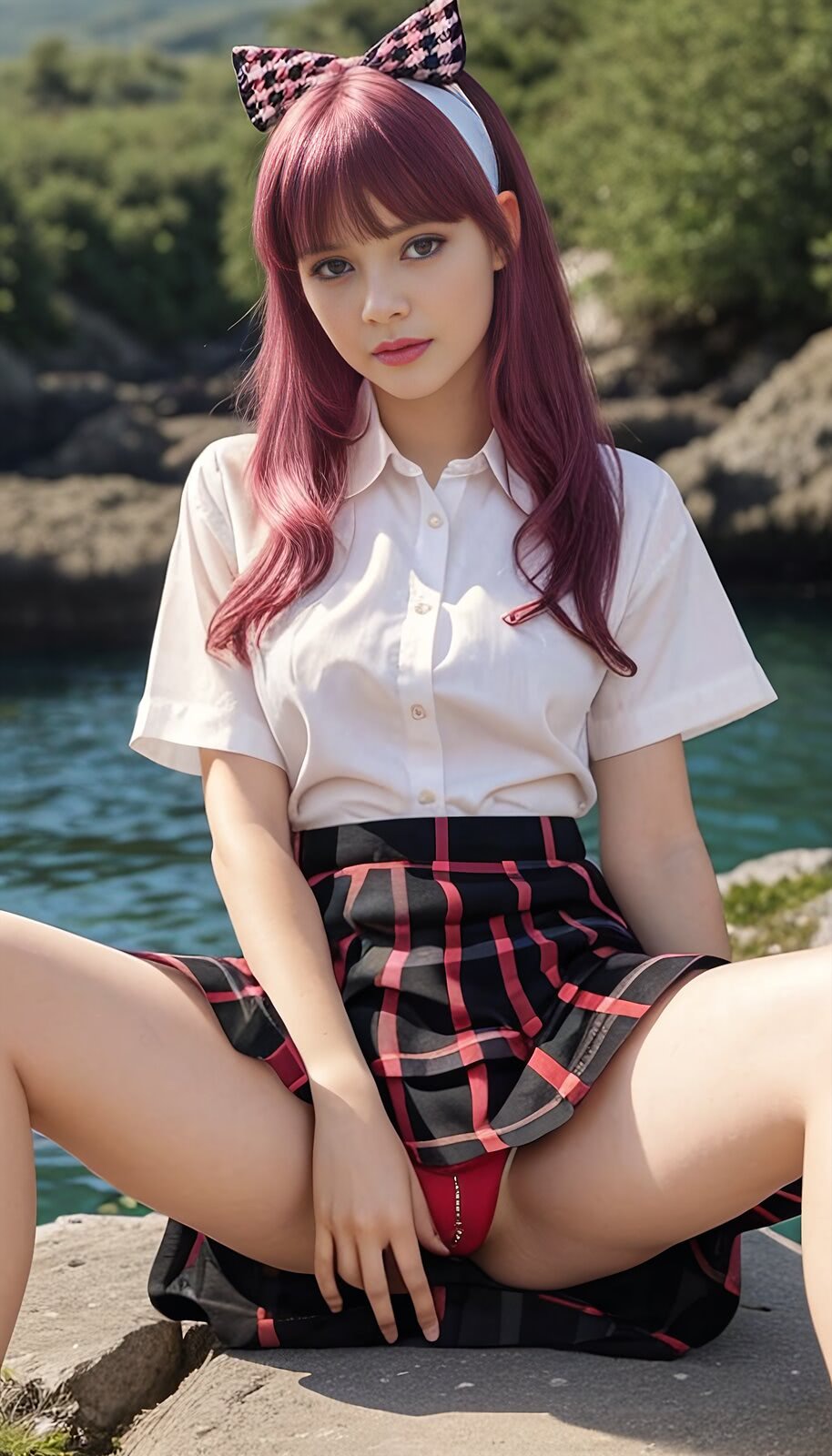 o femeie seducatoare, cu sanii apetisanti si buze senzuale, sta intinsa pe o canapea de catifea rosie. Isi tine parul lung si negru intr-o mana, iar cealalta mangaie usor coapsa goala. lumina difuza accentueaza formele ei voluptoase si creeaza o atmosfera incitanta.