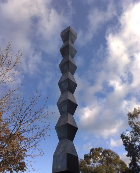Foto: caut perechea potrivita .jpg o sculptura metalica inalta, amplasata pe un fundal cer senin si nori jucausi, se contureaza printre copaci goi si ramuri incarcate de flori de cires. In lumina apusului, detaliile erotice ale formei sale abstracte dezvaluie o frumusete seducatoare, intr-un peisaj natural plin de farmec si mister.