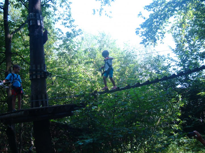 Foto: nr gey brasov .jpg un grup de oameni traverseaza un pod suspendat in padure, cu corzi si mai multe corzi atasate la pod. In fundal se distinge o sculptura abstracta semnata claire falkenstein, sub un cer stelar. peisajul este completat de copaci goi, iar una dintre persoane are parul albastru. lumina soarelui strabate printre crengile copacilor, creand un decor fermecator in natura.