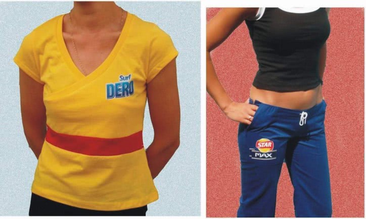Fotografie: video chat download .jpg o femeie imbracata intr-un tricou galben, cu o bluza albastra si pantaloni galbeni se afla in prim-plan, iar alta purtand o camasa neagra peste un tricou galben, toate evidentiind detalii senzuale pe abdomen. texturile din denim si imprimeurile adauga un aer seducator, creand o scena intens realista si plina de farmec erotic subtil.