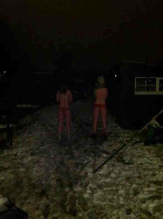 doua femei seducatoare in costume rosii isi croiesc drum prin zapada noptii, pandite de intuneric si padurea misterioasa. parul lor lung si valuri se contopesc cu peisajul natural, in timp ce atmosfera transgresiva amplifica tensiunea erotica a scenei pline de farmec si mister.