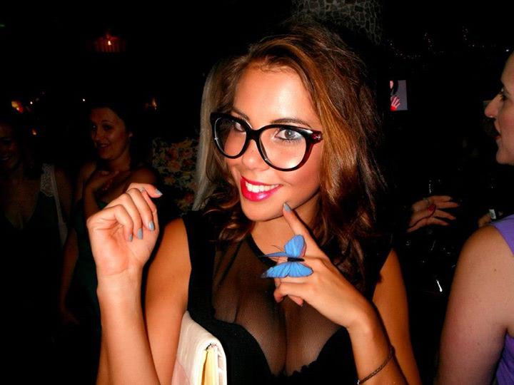 o femeie seducatoare, cu ochelari negri si un zambet misterios, tine in mana o banana si indica spre fata ei cu degetul. chipul ii este accentuat de un look provocator: unghiile negre si violet, un fluture albastru pe frunte, buze pline si par scurt ce completeaza imaginea erotica plina de farmec.