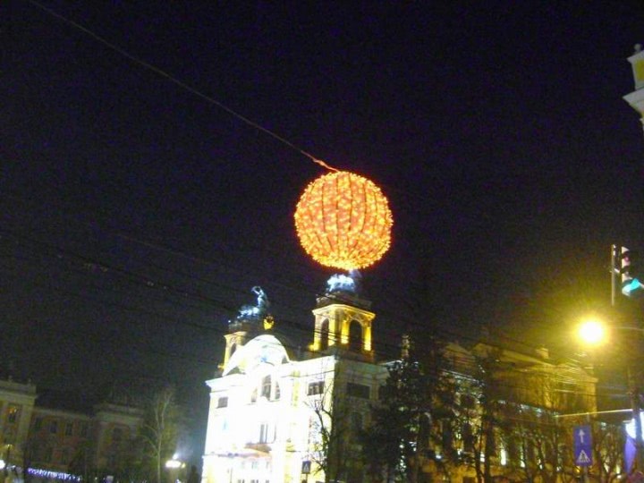 Foto: ma fut cluj .jpg o mare sfera de lumini atarna de un cladiri in oras, pe timp de noapte, inconjurata de o multime de oameni care umbla prin jur. o opera ecologica si art nouveau surprinsa intr-o fotografie incendiara. peisaj urban cu luminile orasului, nori, stalpi de iluminat si reflexii stralucitoare. o imagine captivanta ce te poarta in lumea senzualitatii nocturne.