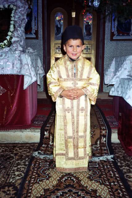 un tanar in haine de preot, stand in fata unei usi, cu un covor pe podea. chipul sau inocent contrasteaza cu privirea seducatoare si zambetul provocator. parul negru cade matasos peste umeri, iar detalii delicate precum bijuterii si gura usor deschisa adauga o nota subtil erotica imaginii pline de mister si farmec.
