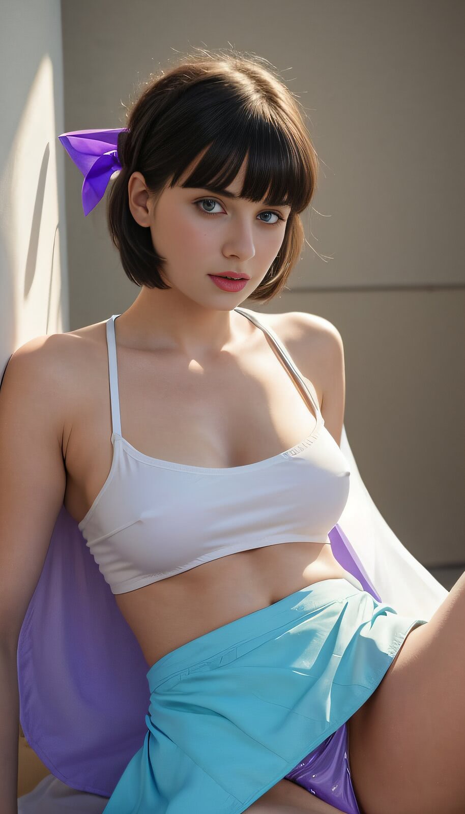 Imagine: femei din venezuela .jpg o femeie cu o fundita mov in par sta pe podea purtand un top alb si o fusta albastra, in stil art nouveau, palid, pastelat. are par negru, buze senzuale si ochii fixati asupra privitorului. detaliile includ machiajul impecabil, sanii medii acoperiti subtil, talia expusa, picioarele desfacute si lenjeria intima. o imagine erotica realizata de echo chernik.