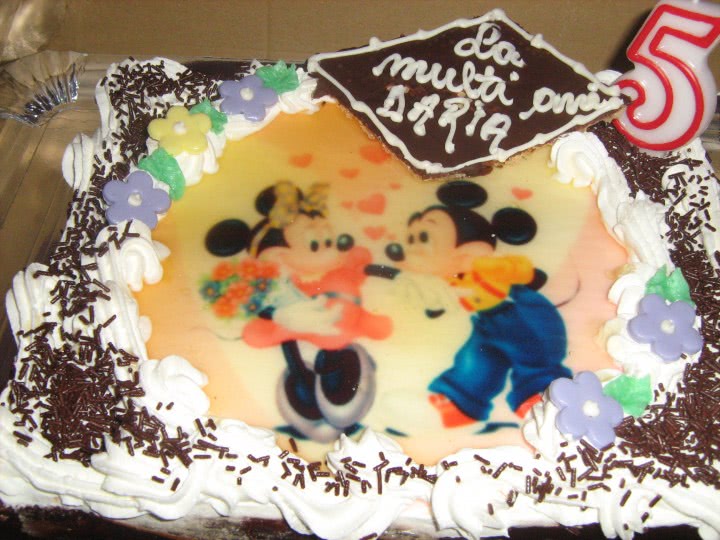 Fotografie: simpatie ro brasov .jpg prajitura de ziua ta, decorata cu o imagine seducatoare a lui mickey mouse si un semn de 5 ani, emana un farmec pastelat si artistic. In fundal usor estompat, detalii florale adauga o nota delicata, in timp ce lumina joaca subtil pe suprafata neteda a tortului. o scena intima si plina de rafinament care starneste dorinta intr-un mod discret dar intens.