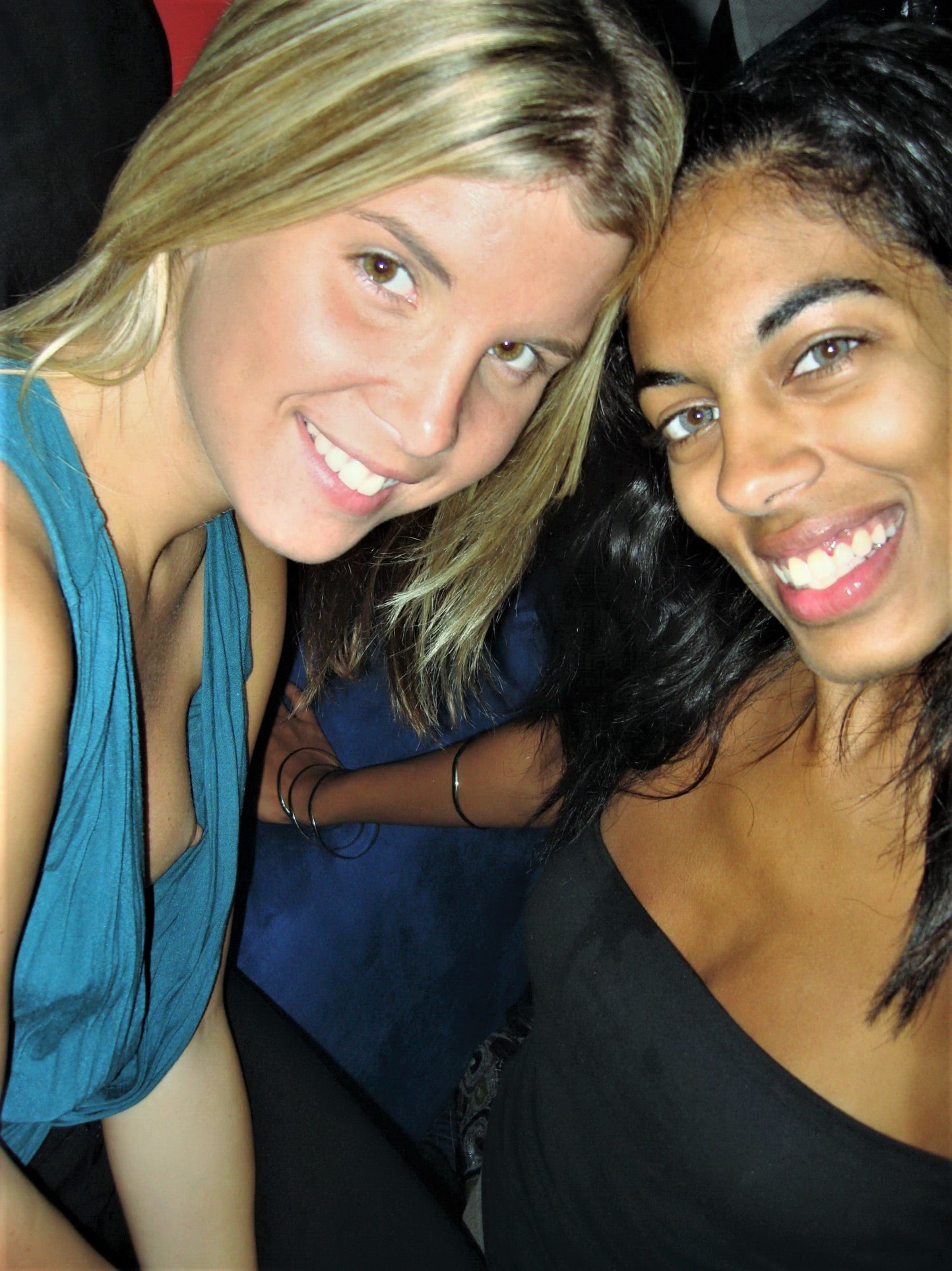 doua femei zambesc pentru aparatul foto in timp ce pozeaza impreuna pe un scaun de masina sau autobuz. ele au tenul usor masliniu, par negru si blond, ochi caprui, decolteuri provocatoare si bijuterii stralucitoare. surad cu gura deschisa, privind direct spre privitor. o imagine realista plina de farmec si senzualitate.