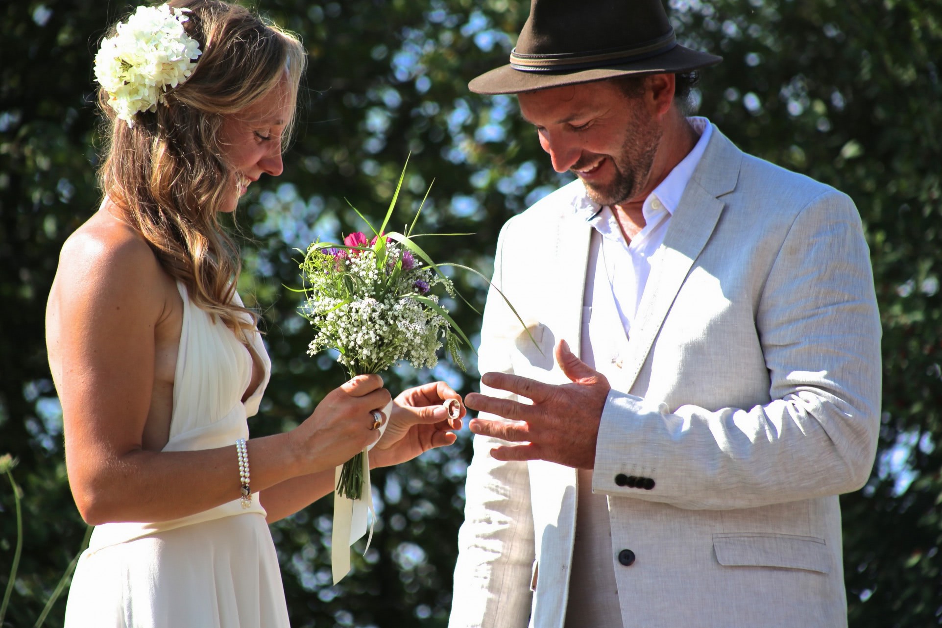 Fotografie: downblouse upskirt oops voyeur sexy dirty .jpg un cuplu seducator schimba flori in fata unor copaci, sub un cer senin. el poarta un costum elegant, cu cravata si barba bine intretinuta, ea imbracata intr-o rochie alba delicata, fara umeri, completata de o coroana de flori. privirile lor inchise exprima dorinta intensa, iar gesturile pline de pasiune dezvaluie o iubire profund erotica.