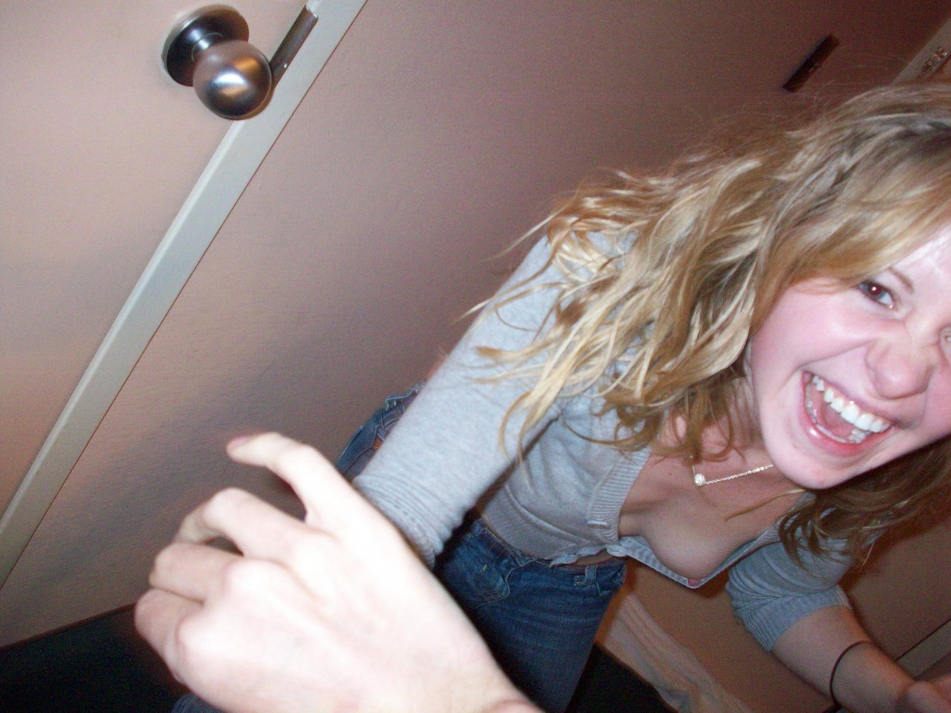 o femeie zambitoare, cu par blond si buze voluptuoase, ciaoa camera in timp ce poarta o bluza denim deschisa, dezvaluind fermecator de sexy sanii si clavicula. bijuterii delicate ii incanta gatul, iar expresia ei jucausa si privirea seducatoare transmit o dorinta ascunsa. In fundal, un barbat surprinde momentul intr-o selfie plina de pasiune.