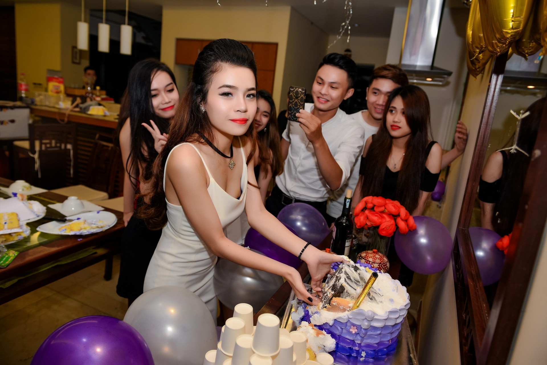 un grup de tinere incantate se aduna in jurul unei mese, unde o femeie seducatoare taie un tort apetisant. parul negru straluceste, iar decolteul provocator atrage priviri. baloane colorate si fructe suculente completeaza scena erotica plina de veselie si dorinta, intr-o atmosfera vibranta si tentanta.