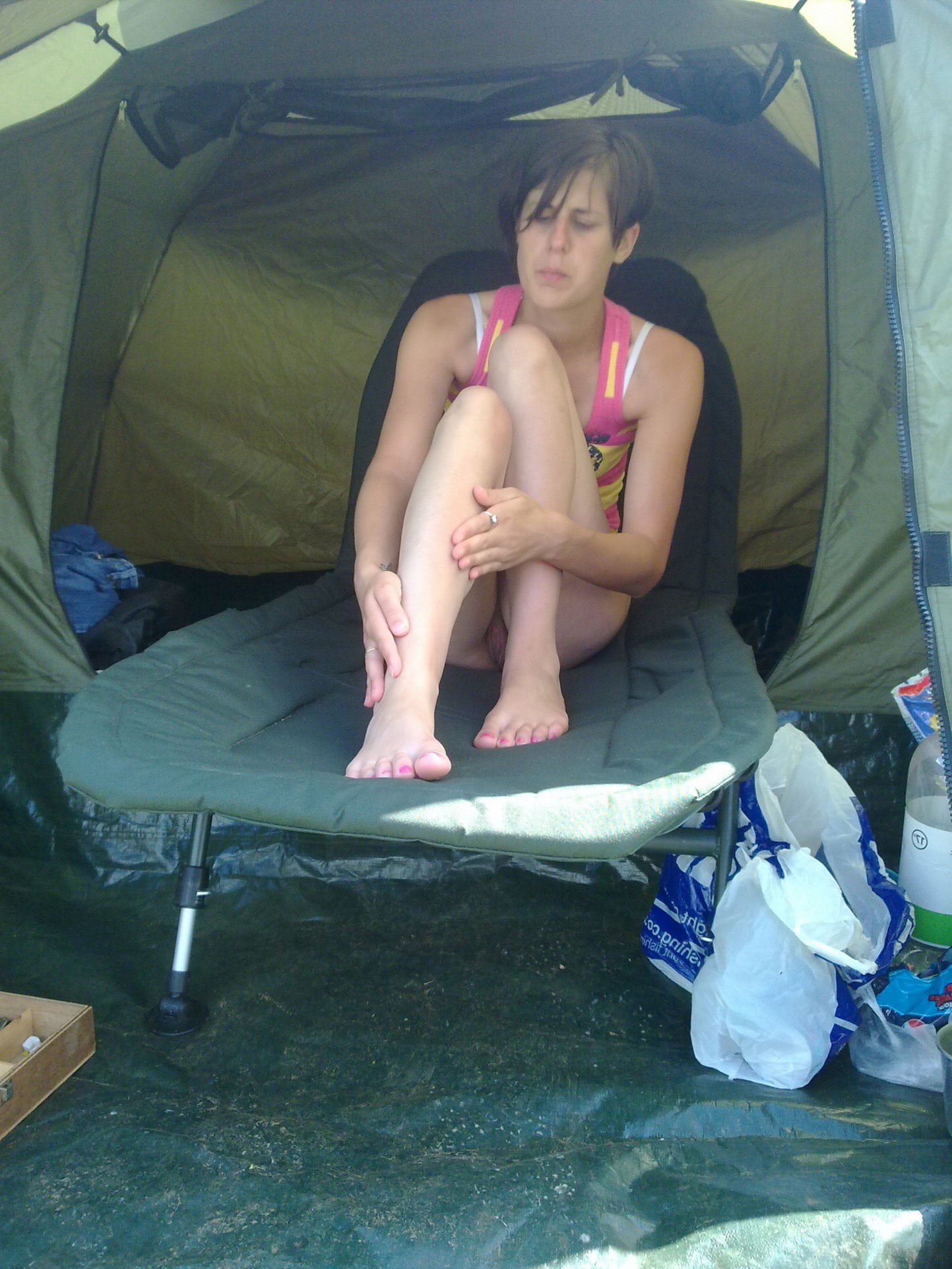 o femeie seducatoare sta in cort, cu picioarele goale intinse pe pamant, iar de aproape o sticla de apa. soarele verii ii lumineaza pielea delicata, in timp ce isi imbratiseaza propriile picioare intr-un gest intim. unghiile albastre si bijuteriile stralucesc subtil, iar cerul plin de stele adauga un aer misterios si erotic scenei pline de dorinta.