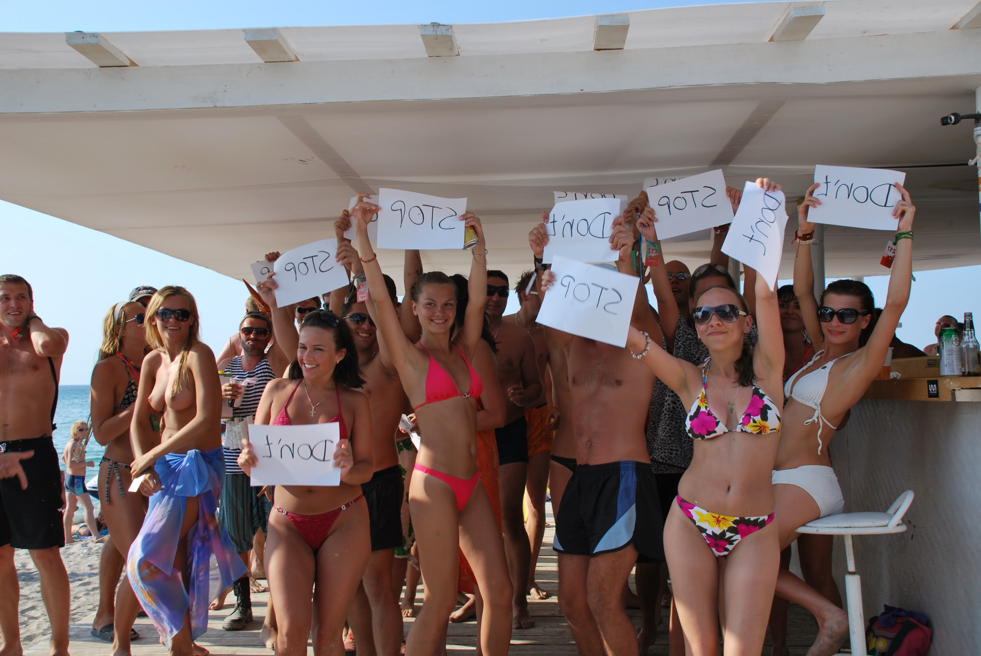 Poza: xxx femei nud la plaja sexy .jpg un grup de persoane tinand in sus pancarte pe o plaja, cu un bar in fundal si multi oameni in jur. miscare kitsch, fotografie, copie xerox. 6+ fete, bratele ridicate, bikini, par negru, bratara, sani generosi, ochi caprui, piele intunecata feminina cu tente foarte inchise la culoare. accesorii: cercei, ochelari de soare, bentita in cap si casti. zambet larg si gura deschisa. o atmosfera incitanta