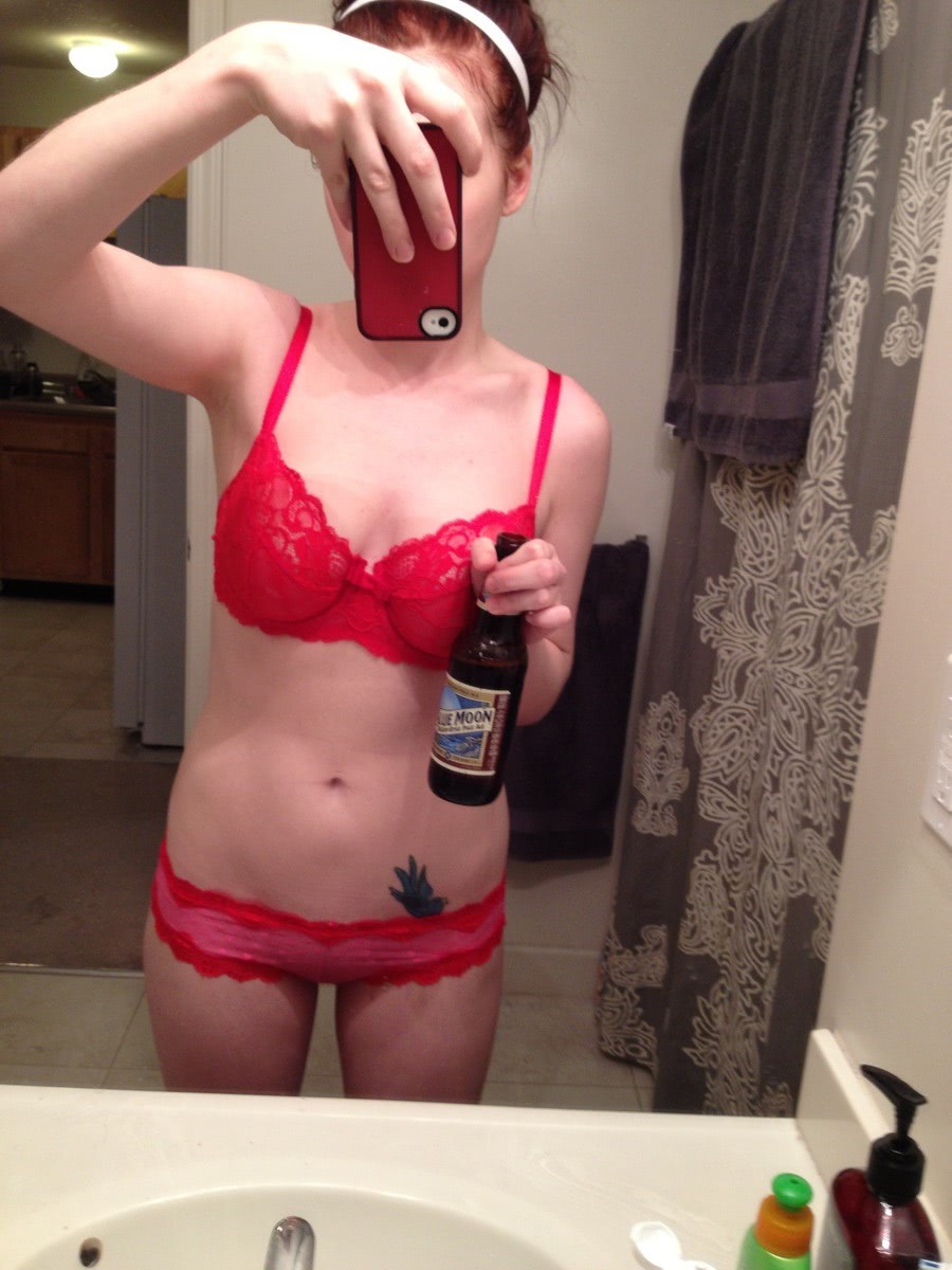Ilustratie: femei satu mare fusta .jpg o femeie in sutien si chiloti rosii face un selfie in oglinda baii, cu o sticla de alcool, piele palida, un tatuaj. detalii: eve ryder, 1 fata, sutien, sanii, sticla, chiloti roz si rosii, reflexie. un moment intim capturat: telefonul mobil tinut in mana. o imagine incitanta cu o atmosfera seducatoare.