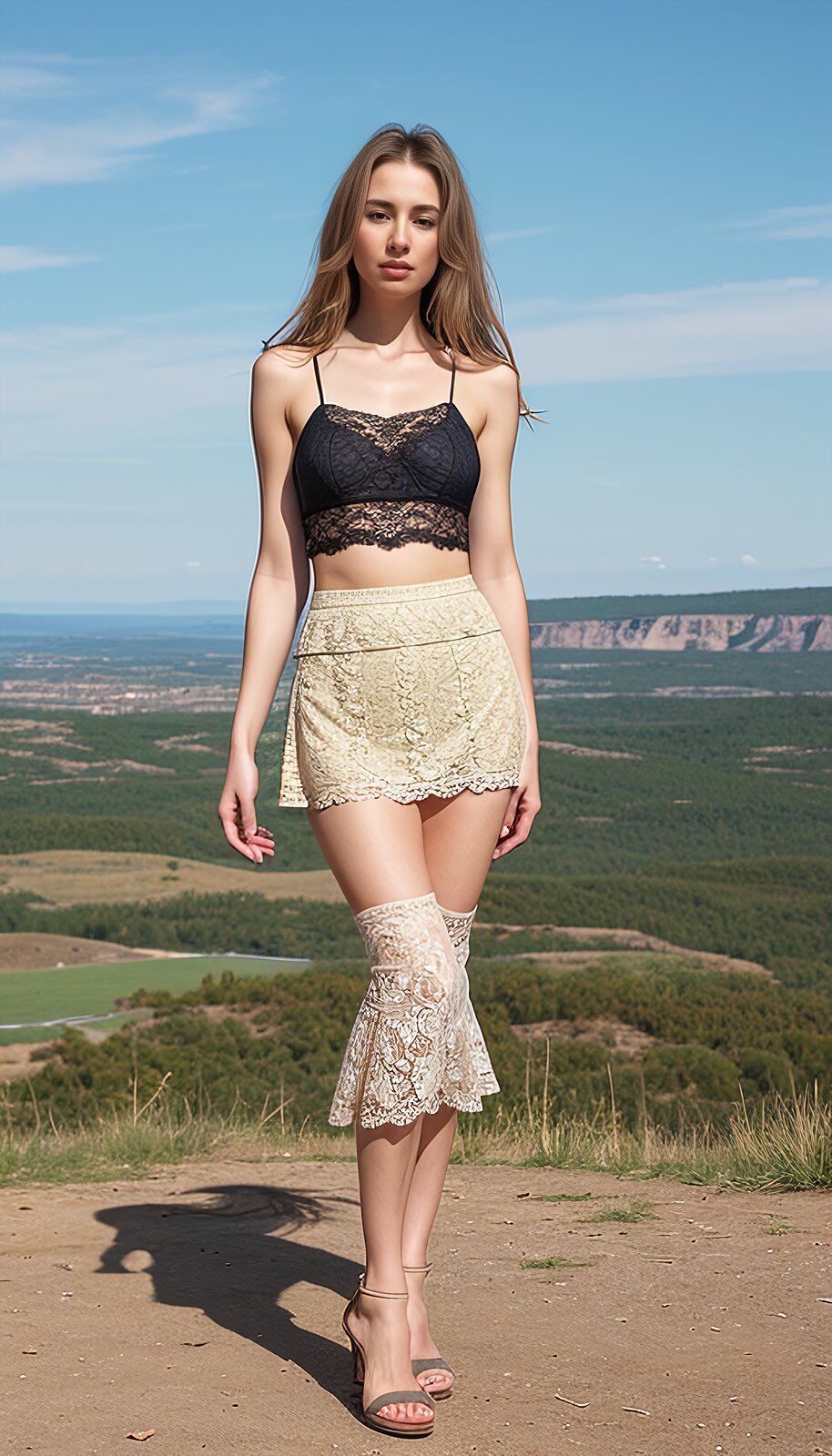 o femeie seducatoare, purtand o fusta scurta si un top de sutien din dantela fina, paseste pe un drum de pamant langa o vale spectaculoasa. pielea ei delicata si sanii imbuibati ies in evidenta sub lumina soarelui, in timp ce lungile sale suvite stralucesc. imaginea dezvaluie frumusetea nudului subtil, intr-o atmosfera naturala si plina de erotism.