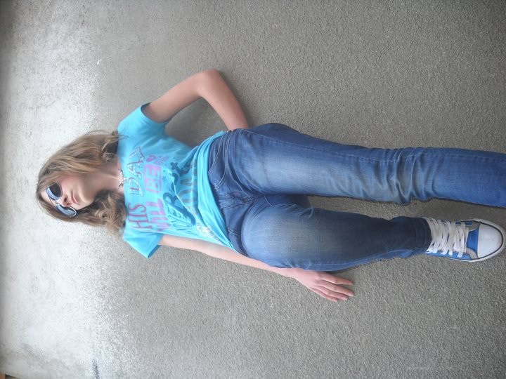 o femeie intinsa pe podea, purtand ochelari de soare si o camasa albastra cu un top albastru si blugi, superflat, plat, ca o coperta de album. par blond lung, pantaloni din denim, tricou scurt cu scrieri pe haine. stand in picioare singuratica, incaltata cu adidasi si ochelari de soare pe cap. o imagine realista si provocatoare.