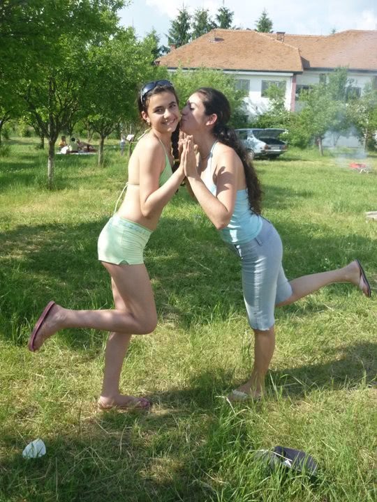 doua fete se joaca in iarba impreuna, una tinandu-si mainile la gura si cealalta tinandu-i mana. imaginea surprinde un moment intim, sub soarele verii, cu detalii precum parul negru, o casa si un gard de lemn. iarba verde, copacii si raul adauga o nota erotica peisajului idilic.