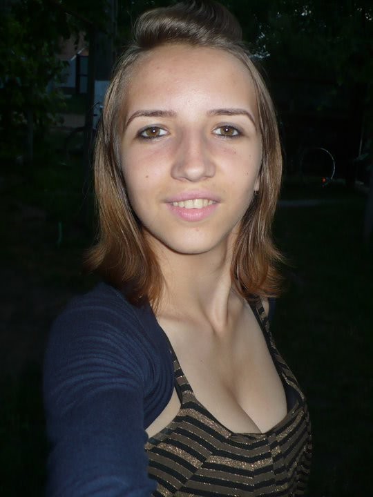 o femeie intr-o camasa albastra si cu dungi alb-negru zambeste la camera, avand un copac in fundal. detaliile includ ochi caprui, decolteu, buze senzuale si un pistrui pe san. poza este superflata, de 150mp, capturata de adrienn henczn & deák. o privire seducatoare si o atitudine solo completa imaginea erotica.