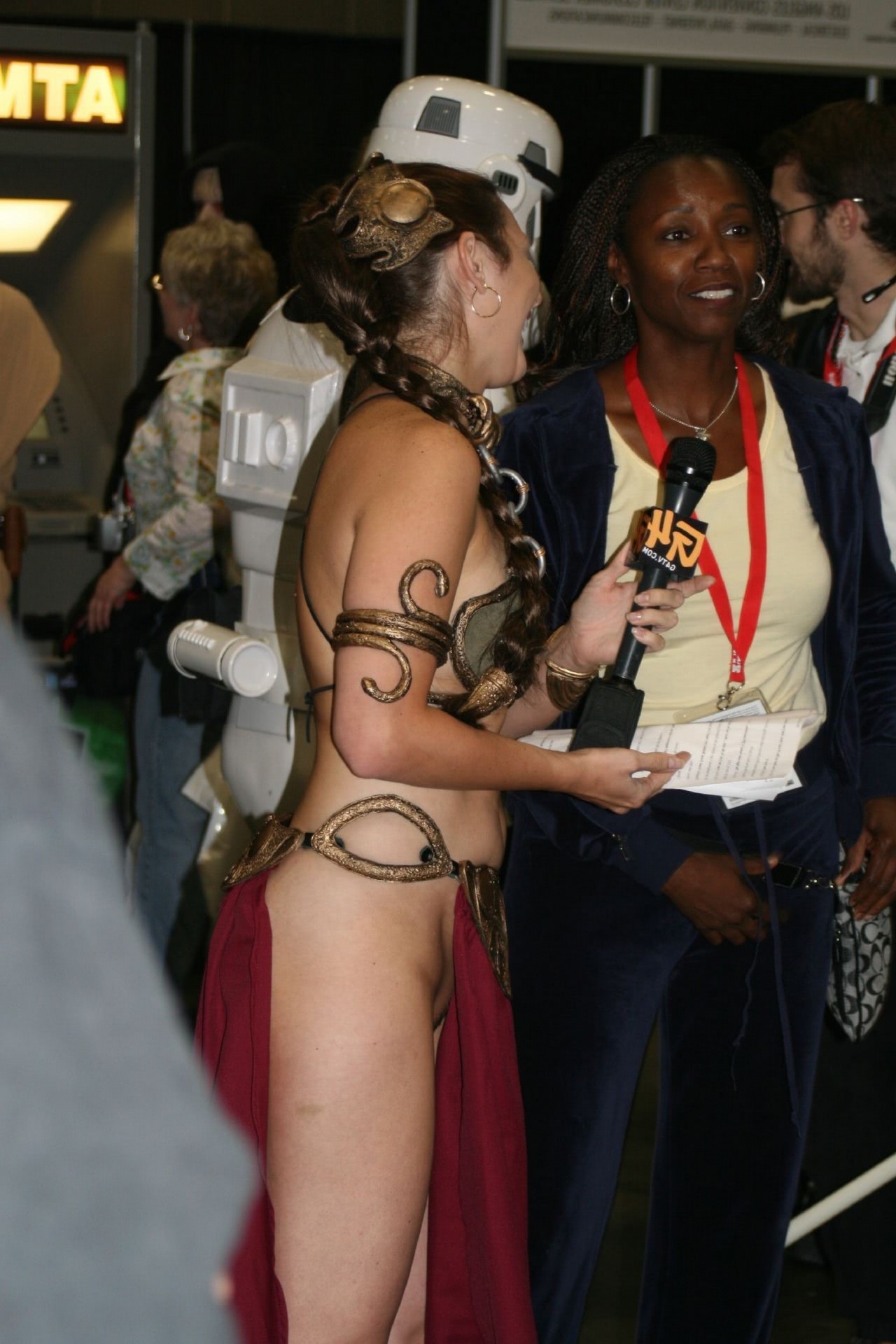 Foto: fete goale tinere superbe .jpg o femeie seducatoare in costum provocator vorbeste cu un barbat intunecat la scena, tinand microfonul. ea poarta o rochie dezvaluitoare, accesorii stralucitoare si are parul lung si impletit. In jur, multiple prezente feminine si masculine creeaza o atmosfera intensa, plina de erotism subtil, in timp ce holograme futuriste adauga mister scenei incitante.