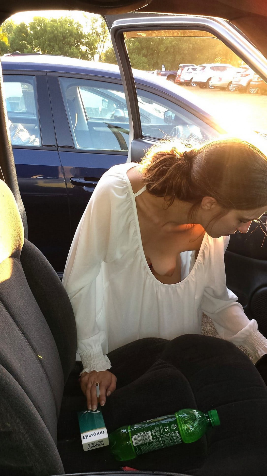 o femeie seducatoare sedea pe bancheta din spate a masinii, tinand o sticla de alcool intr-o mana si una de apa in cealalta. rochia lunga ii evidentia formele voluptoase, iar privirea parea jucausa si provocatoare. sanii plini si clavicula delicata completau imaginea erotica, intr-o atmosfera intima si plina de dorinta.
