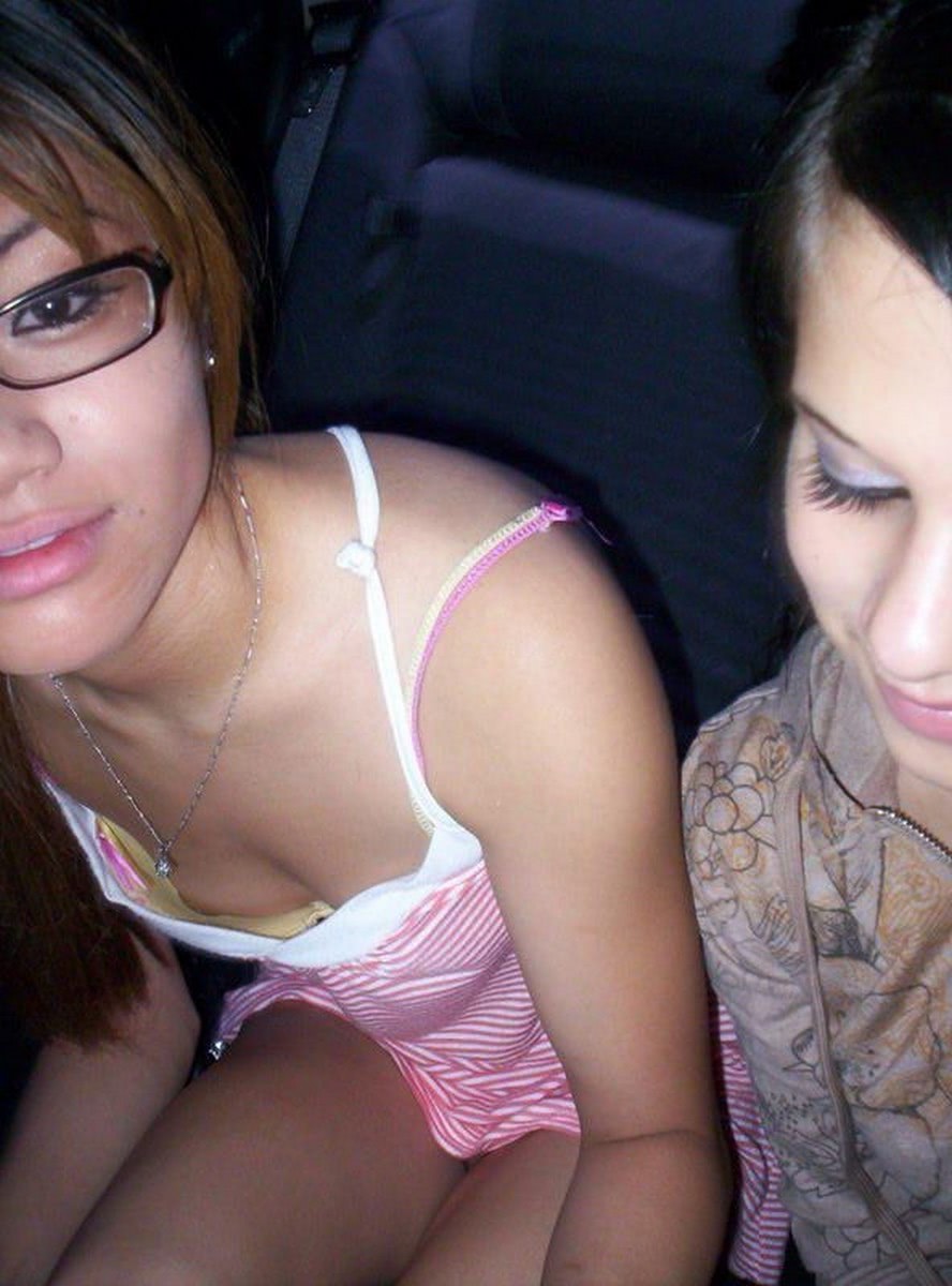 doua tinere seducatoare stau in masina, fascinate de ecranul telefonului. una are par blond si o privire surprinsa, cu buze senzuale si un decolteu imbietor dezgolit. poarta o pereche de ochelari delicati, colier cu inimioara si dresuri translucide, accentuand formele apetisante ale corpului ei. atmosfera e plina de erotism subtil si dorinta ascunsa.