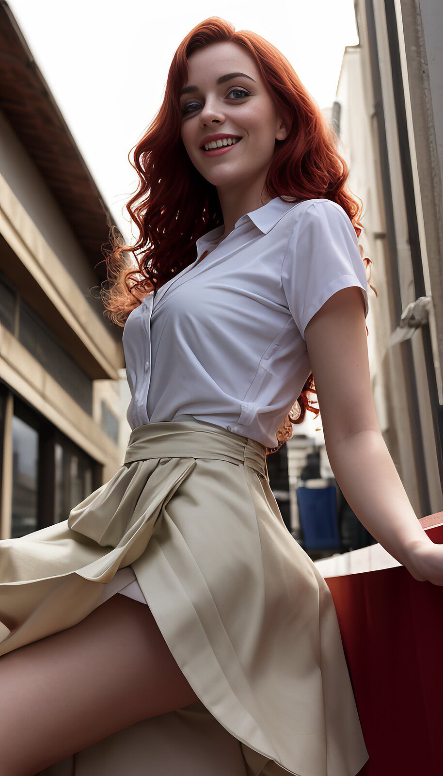 Fotografie: femei cu tite mari .jpg o femeie cu par rosu stralucitor, purtand o fusta si o camasa alba, se afla in interior, intr-o pozitie seducatoare. parul ei lung si ondulat cade fluid pe umeri, iar privirea direct catre privitor emana intimitate. zambetul subtil si dintii albi adauga un farmec erotic acestei imagini pline de eleganta si pasiune.