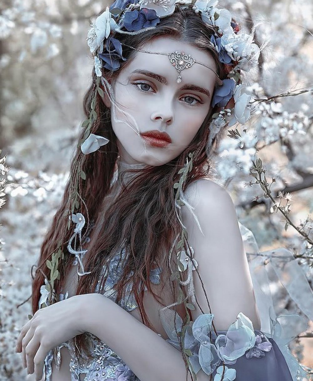 Imagine: grasa bukkake .jpg o femeie cu o coroana de flori pe cap si o rochie pe corp, intr-un camp de flori, arta gotica, fermecatoare, o pictura fotorealista. are ochi gri, buze senzuale si par lung impletit. privirea ei se pierde in a ta. fundalul este estompat: un copac gol si fulgi de zapada cad incet in jurul ei. o imagine poetica ce te captiveaza instantaneu.