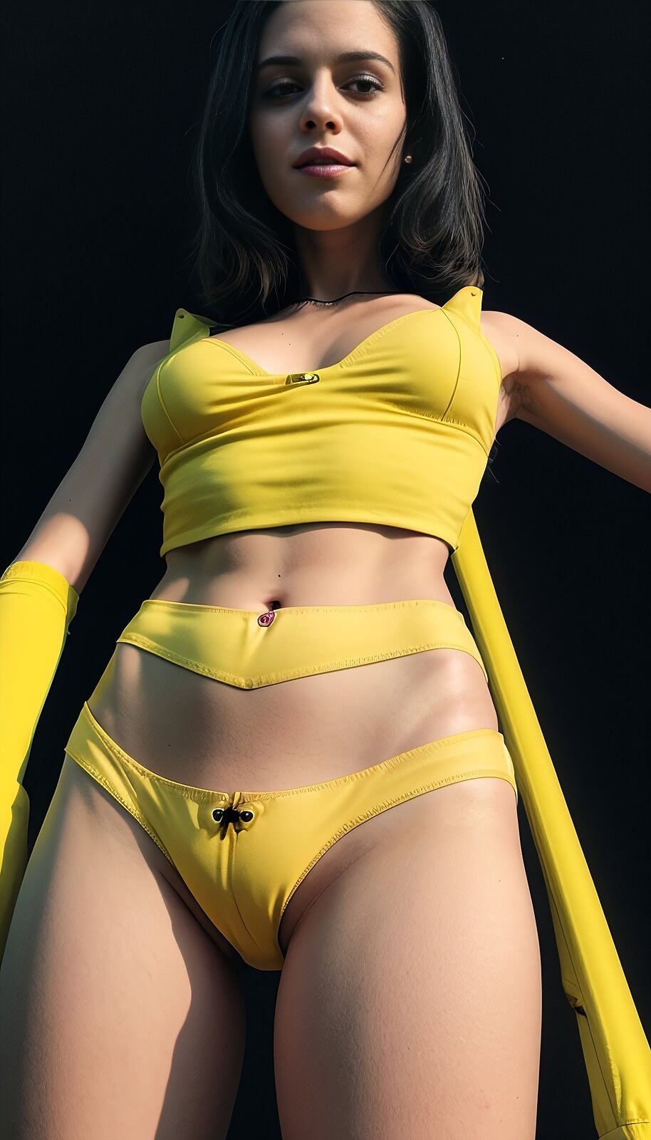 o femeie intr-un top de bikini galben si manusi galbene pozeaza cu bratele la spate, in fata unui tablou fotorealistic. detalii picante includ par negru, ochi caprui, bijuterii, buze senzuale si piercinguri. ea poarta lenjerie intima galbena care completeaza paleta sa de culori vibrante. o imagine plina de erotism si rafinament.