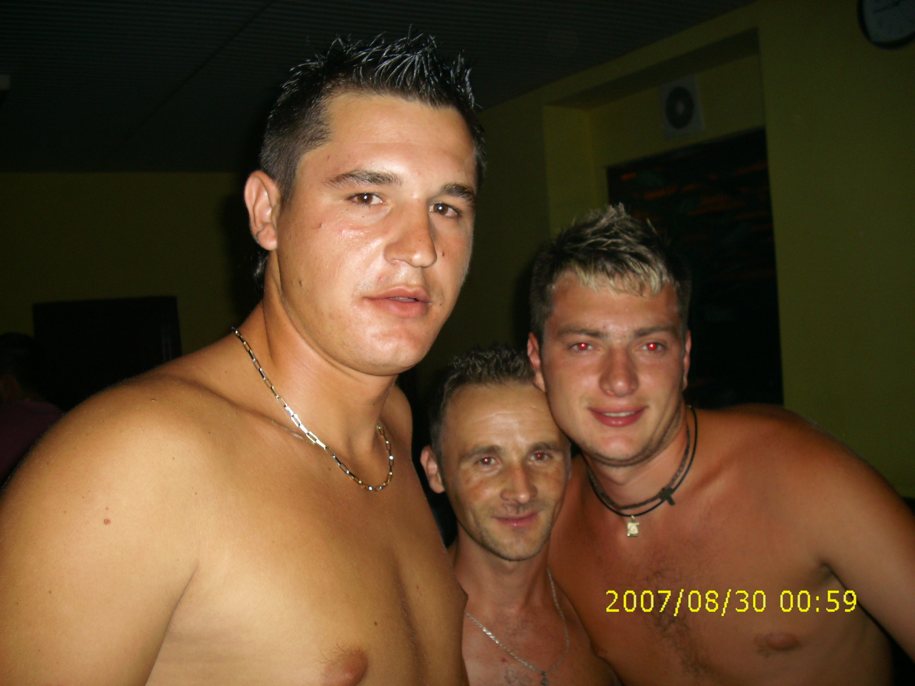 Foto: sex pe bani piatra neamt .jpg trei barbati seducatori, pe fondul unui perete galben si verde, isi etaleaza trupurile dezgolite. unul poarta un colier cu margele si un lant cu cruce, altul are o inima stralucitoare la gat, iar cel din centru isi evidentiaza sanii si buzele senzuale. privirea lor captivanta te lasa fara suflare intr-o atmosfera incarcata de erotism subtil.