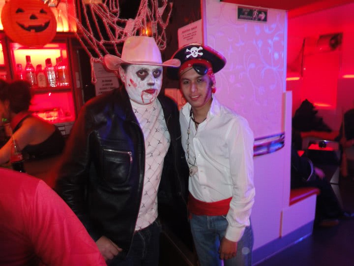 Poza: shego costume halloween .jpg doua persoane infasurate in haine de zombie, intr-un bar cu lumini rosii si decor de halloween pe tavan, isi etaleaza trupurile dezgolite sub hainele uzate. denim-ul le modeleaza formele seducatoare, iar luminile neon scalda pielea lor palida. In interiorul trenului, baieti multumiti si priviri pline de dorinta completeaza atmosfera incarcata de erotism intens.
