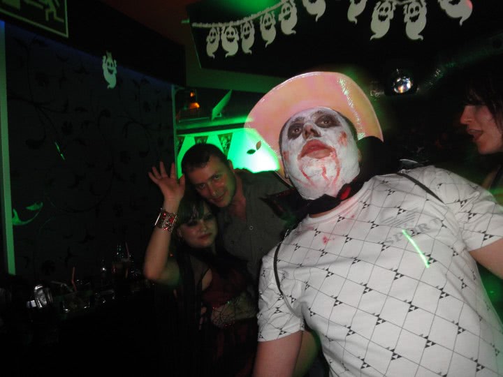 Ilustratie: publi24 neamt imobiliare .jpg un barbat cu fata pictata in stil clovn, la o petrecere plina de oameni si lumina verde. corpul sau rotund, acoperit de bijuterii si bratari, emana o senzualitate cruda. parul ras, mustata proeminenta si expresia parodica adauga un aer erotic si jucaus scenei, creand o atmosfera incendiara si plina de erotism subtil.