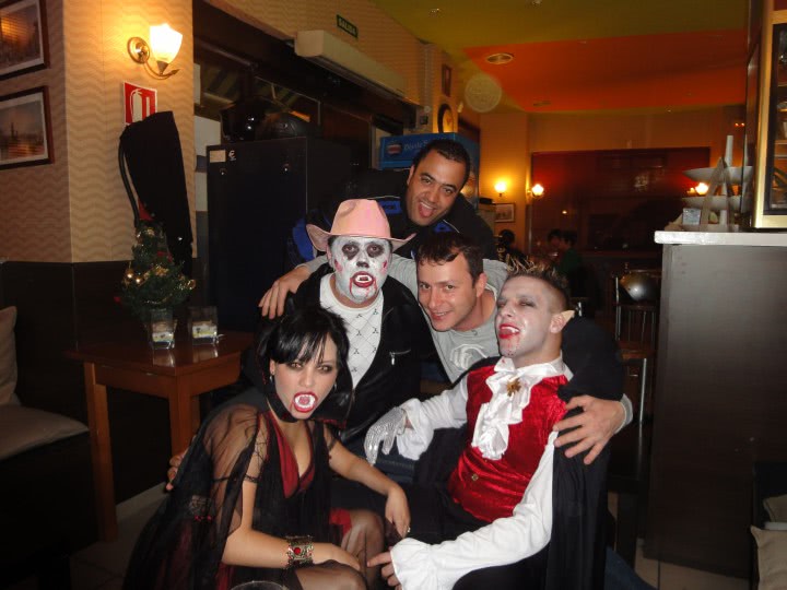 Foto: chatroulette portugal .jpg un grup de oameni in costume de clovni, intr-un restaurant cu tematica gotica si horror, pozeaza alaturi de un barbat imbracat in costum. fiecare detaliu seducator a€“ pielea expusa, buzele rosii si privirile provocatoare a€“ creeaza o atmosfera intensa si erotica. In jur, tineri curajosi, cu parul negru si accesorii stralucitoare, adauga o nota misterioasa si senzuala scenei pline de tensiune.