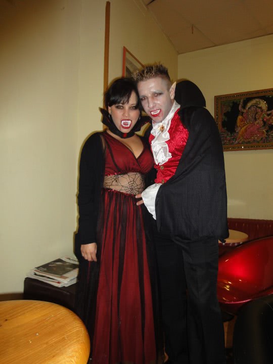 Ilustratie: catuse politie .jpg un cuplu seducator, in costume de dracula si mireasa vampir, se imbratiseaza intr-o camera intunecata. ea are parul negru ca abanosul, urechi ascutite si ochi plini de dorinta, in timp ce el o tine strans, cu mainile pe talia ei. rochia ei neagra si manecile largi dezvaluie zone intime, iar atmosfera misterioasa amplifica tensiunea erotica dintre ei.