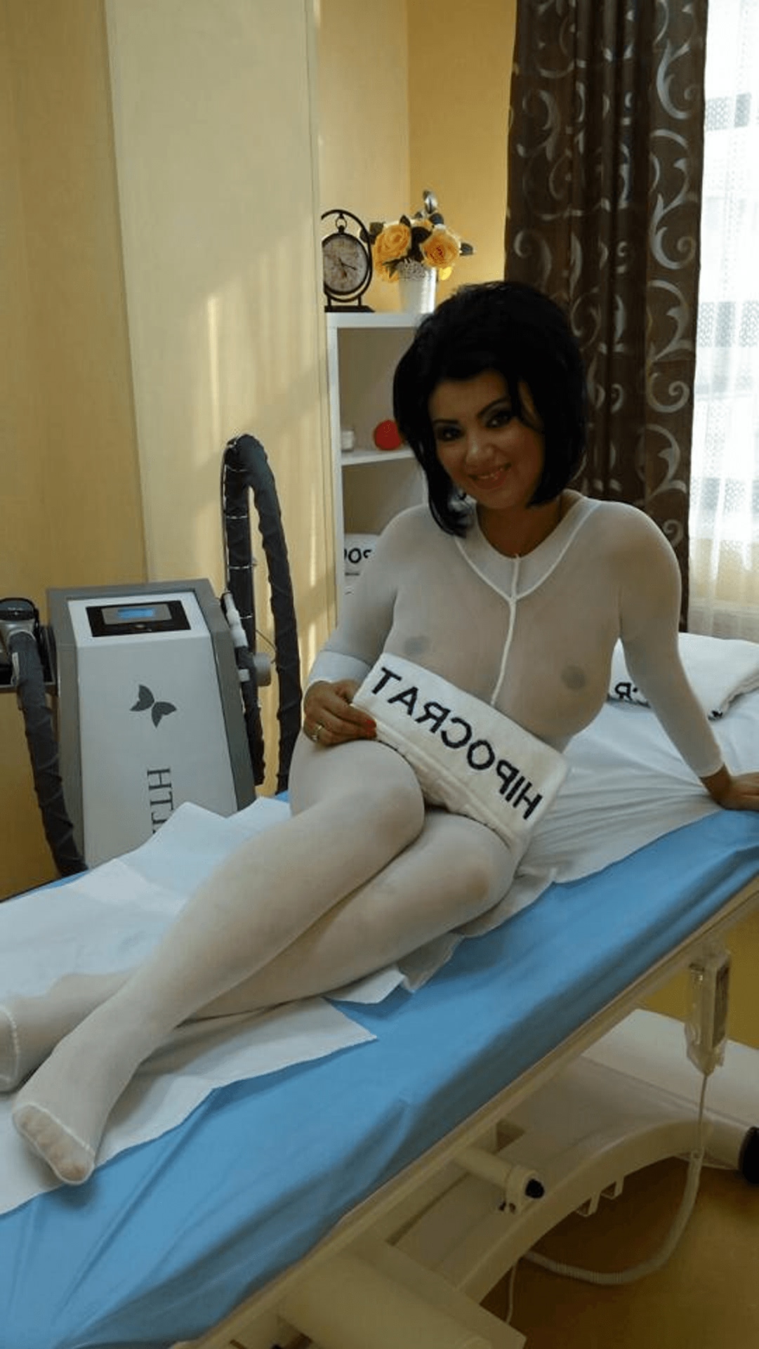 Imagine: adriana bahmuteanu goala .jpg o femeie intr-o camasa alba sta pe un pat de spital, cu un semn care spune "hirobat, holografie, ultra high definition", iar in spatele ei se vede un hologram. are par negru, sani si sfarcuri vizibile, picioare incrucisate si este desculta. poarta par scurt si arata foarte realist. o imagine solo incitanta.