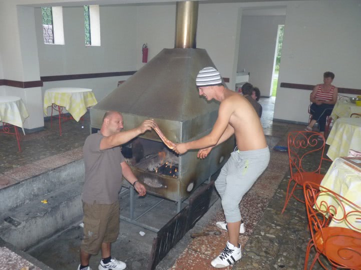 Imagine: intalnire cu destinul .jpg doi barbati stau in fata unui cuptor imens intr-un restaurant plin de mese si scaune, unul dintre ei introducand ceva fierbinte in interior. In fundal, o fata cu parul negru, purtand pantaloni si adidasi albi, pare sa se uite cu fascinatie la scena pasionala ce se desfasoara inaintea ochilor sai. atmosfera e incarcata de dorinta si erotism subtil.